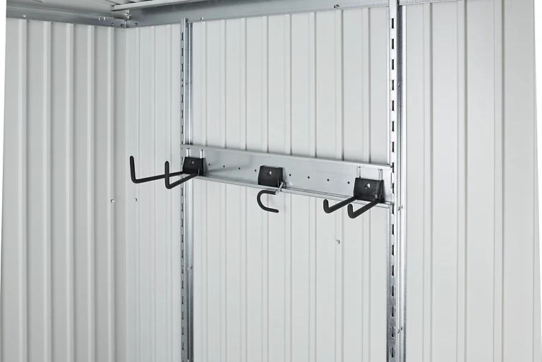 Inclus : deux double crochets, un crochet pour outils à manche et un rail à installer sur les 2 fixations verticales.